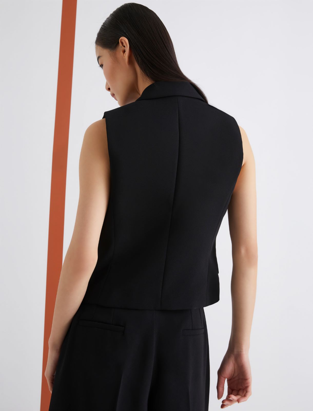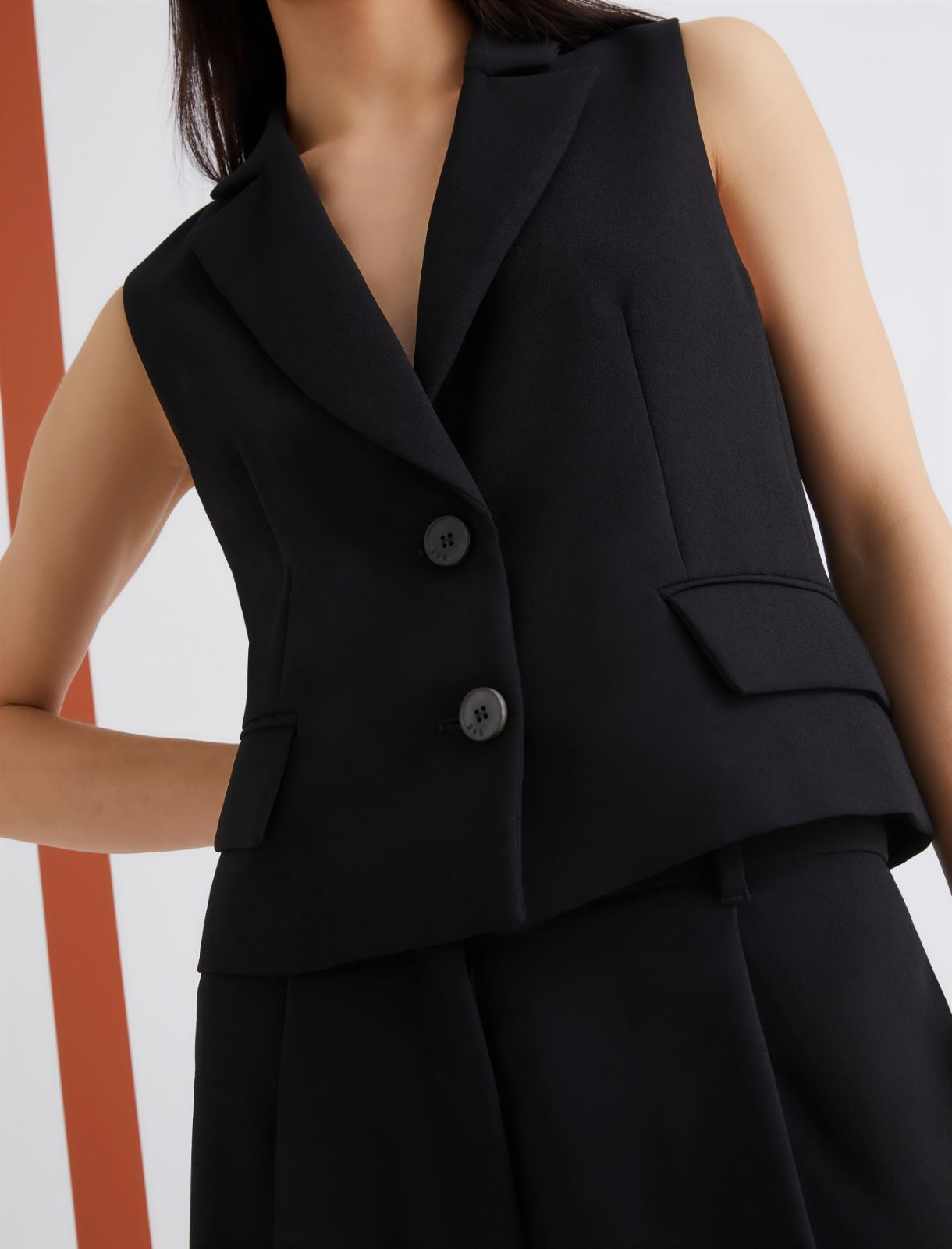 Gilet in crêpe envers satin. Fit femminile sfiancato. Scollo con rever. Chiusura con due bottoni. Tasche laterali con patta e filetto. Modello foderato