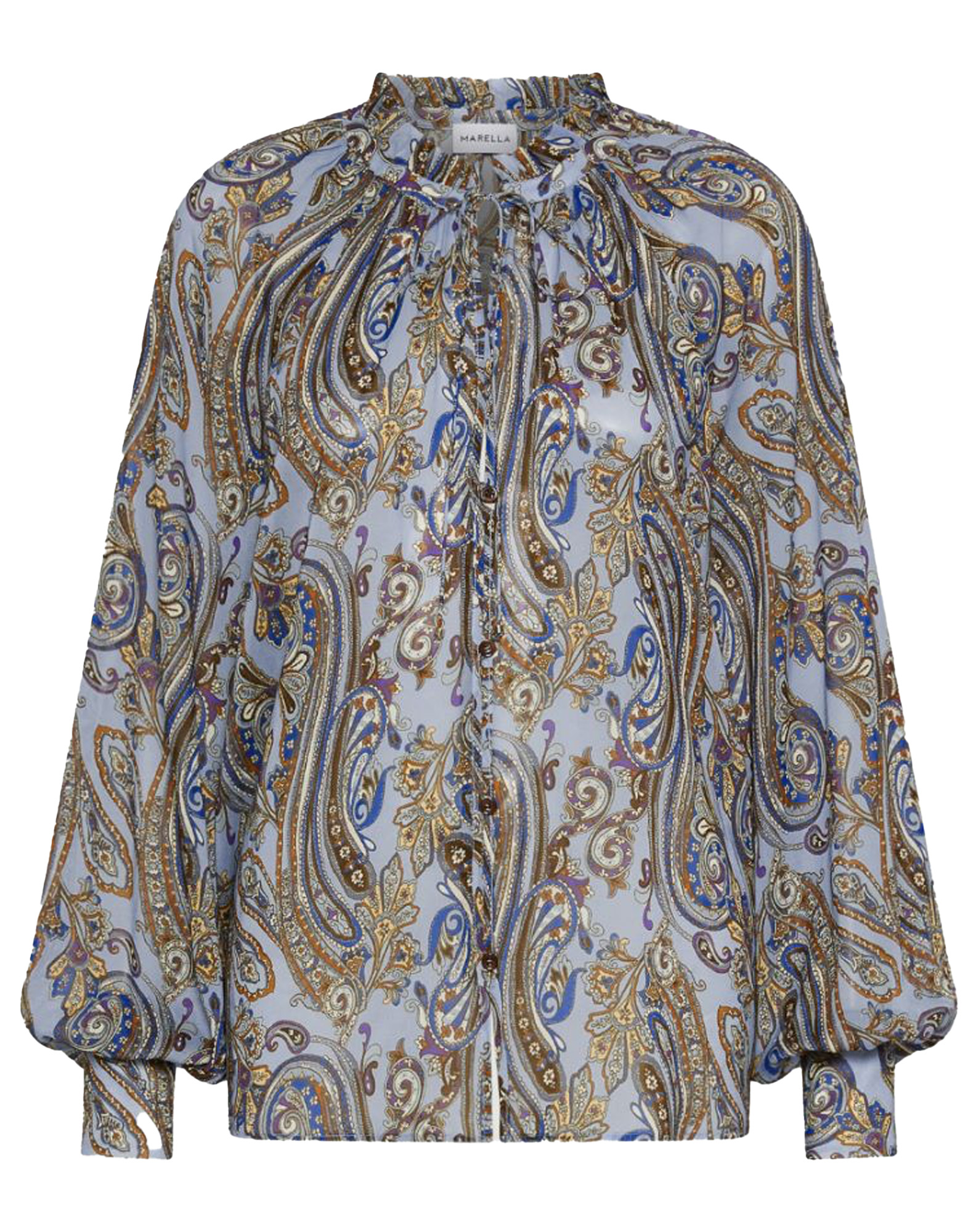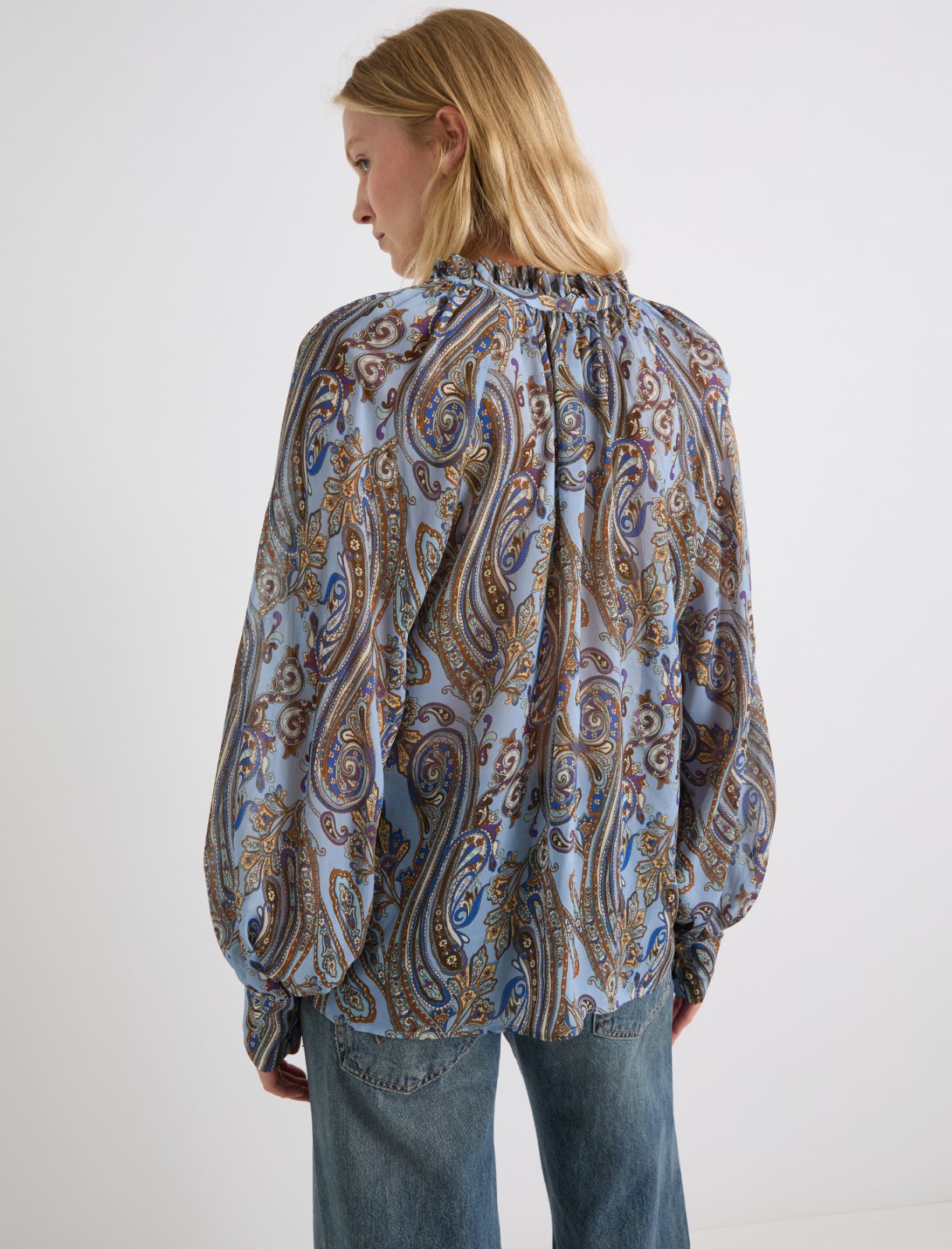 Blusa in georgette di viscosa stampa cachemire, linea svasata, laccetti inseriti nello scollo con finalini in metallo galvanica oro chiaro all'estremità, chiusura con bottoni e asole volanti sul centro davanti, maniche lunghe ampie a raglan a sbuffo e polsi alti con bottoni.