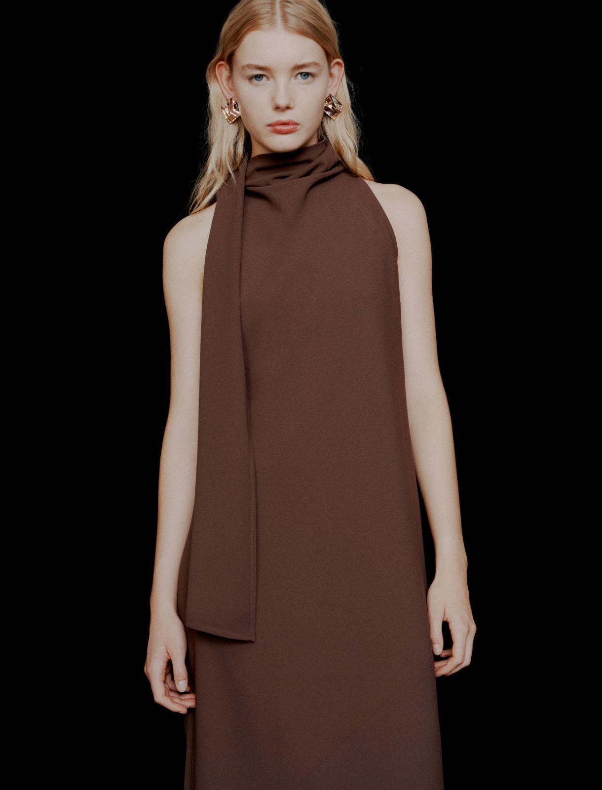 Abito in crêpe envers satin. Fit regolare. Scollo leggermente rialzato con sciarpa da annodare. Chiusura con bottone sulla spalla sinistra.