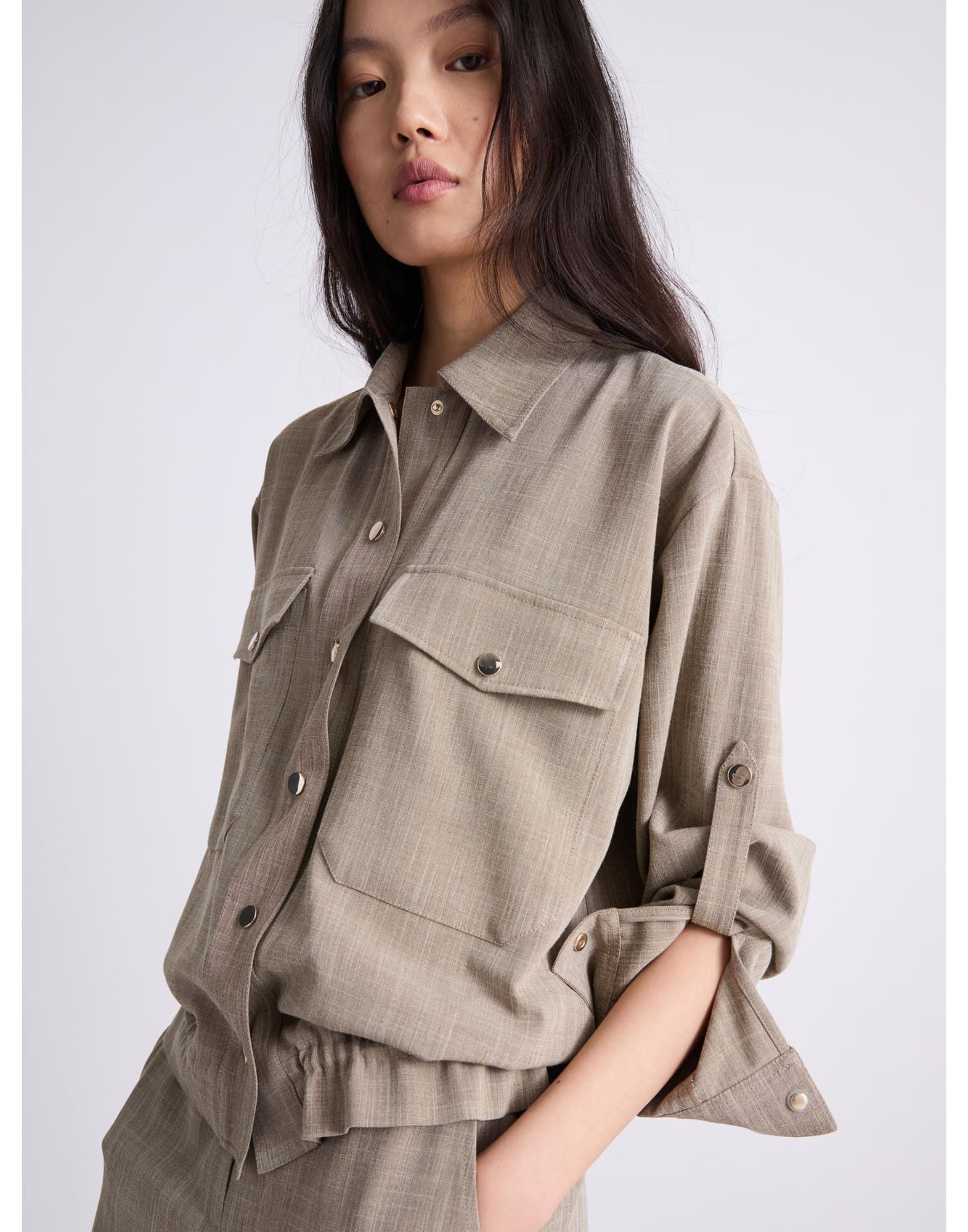 Giacca camica in tinto filo fluido stretch con colletto a camicia, maniche lunghe con alamaro e bottone interno per bloccare la manica risvoltata, chiusura sul davanti con bottoni a pressione metallici in galvanica oro chiaro, coulisse al fondo con cordino e finalino in metallo galvanica oro chiaro, tasche applicate con pattina e bottone a pressione metallico in galvanica oro chiaro a vista.