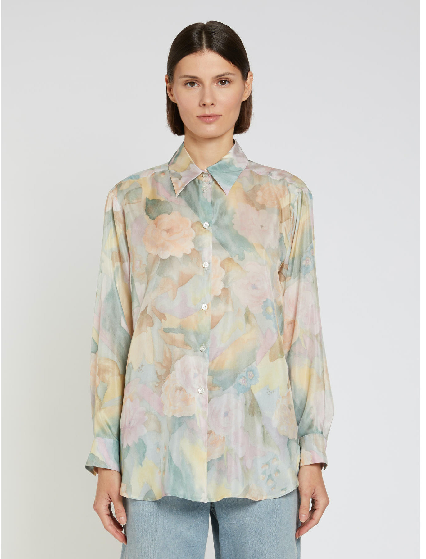 Una delicata stampa pastello decora con nuance sfumate questa camicia in pura seta habotai. Leggera ed elegante, si abbina con pantaloni sartoriali, gonne o denim, in un gioco di abbinamenti super versatile.