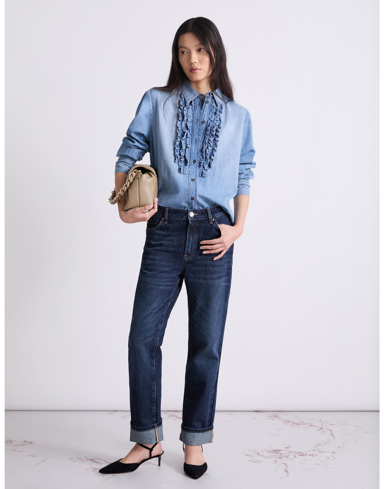 Camicia con rouches in denim leggero, colletto a camicia, maniche lunghe a giro, chiusura sul davanti con finta e bottoni a vista, dietro con sprone, polso alto, due bottoni per parte e sparato a uomo, fondo camicia stondato sia davanti che dietro.