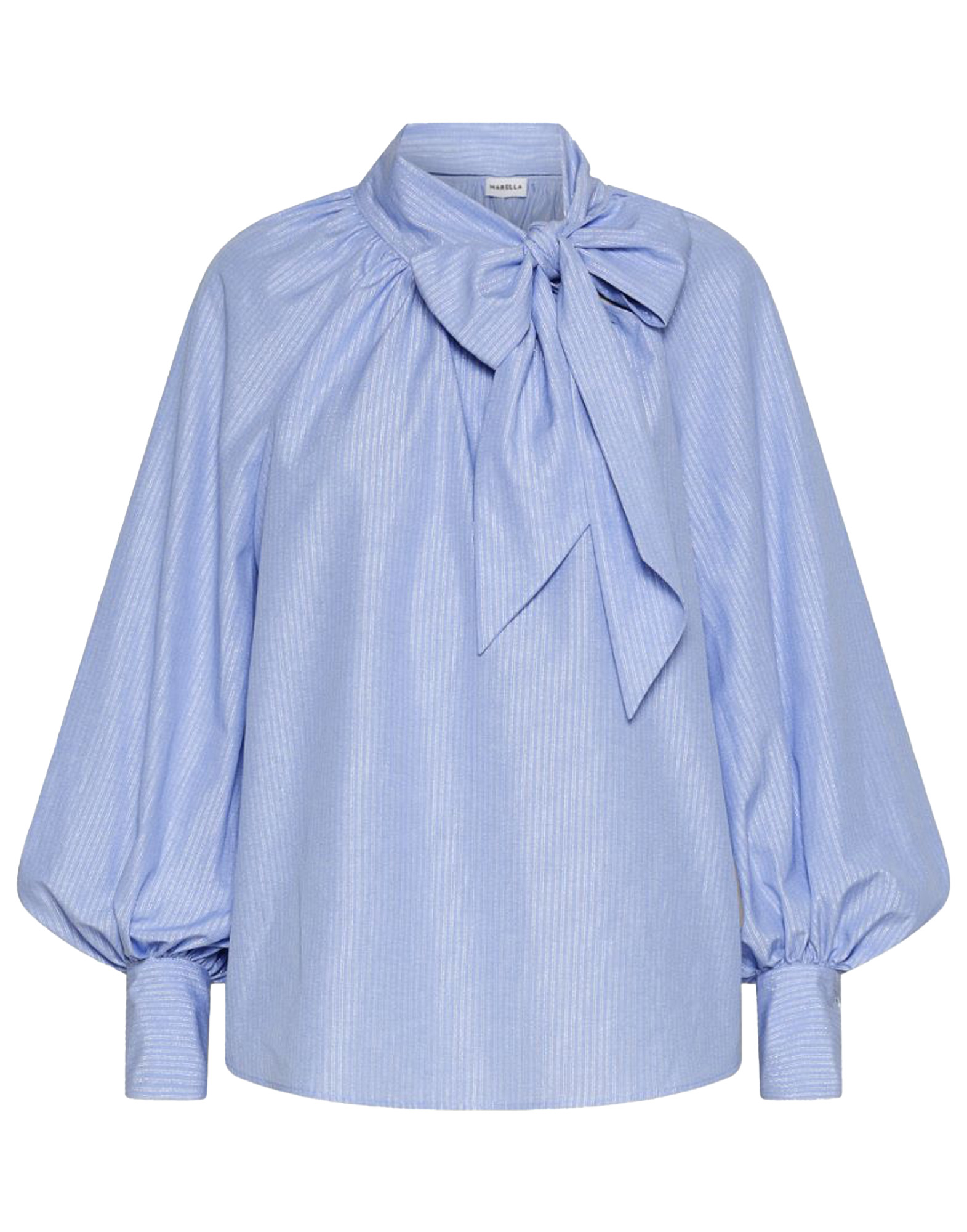 Blusa di linea leggermente svasata in popeline con gessatura lurex, sciarpina e scollo a V che sfoga nel giro, maniche lunghe a sbuffo, polsi alti con bottoni.