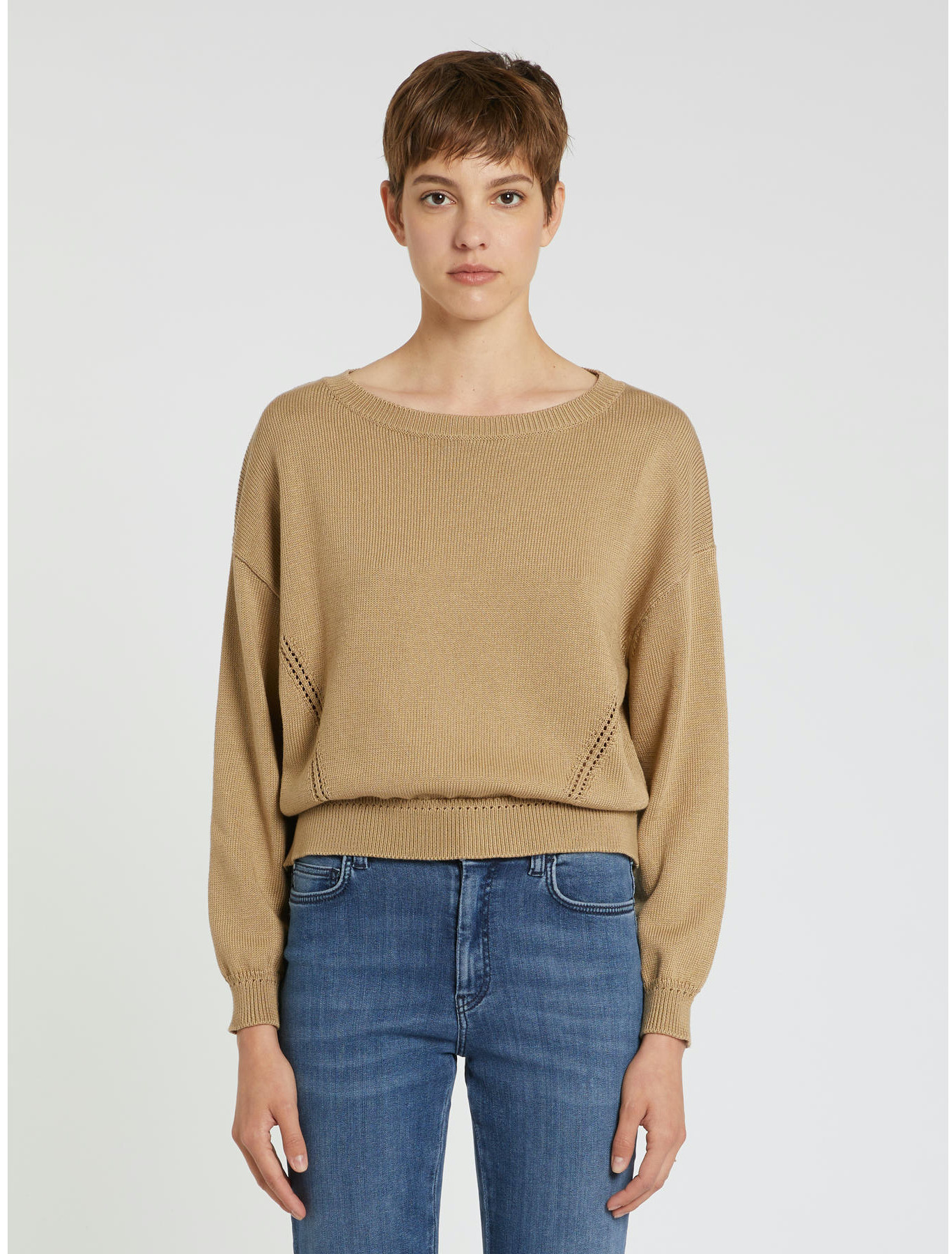 Maglia in cotone. Fit regolare. Linea morbida con bordi a coste. Scollo a barchetta e spalla scesa. Motivo di punti traforati su busto, polsi e fondo capo.