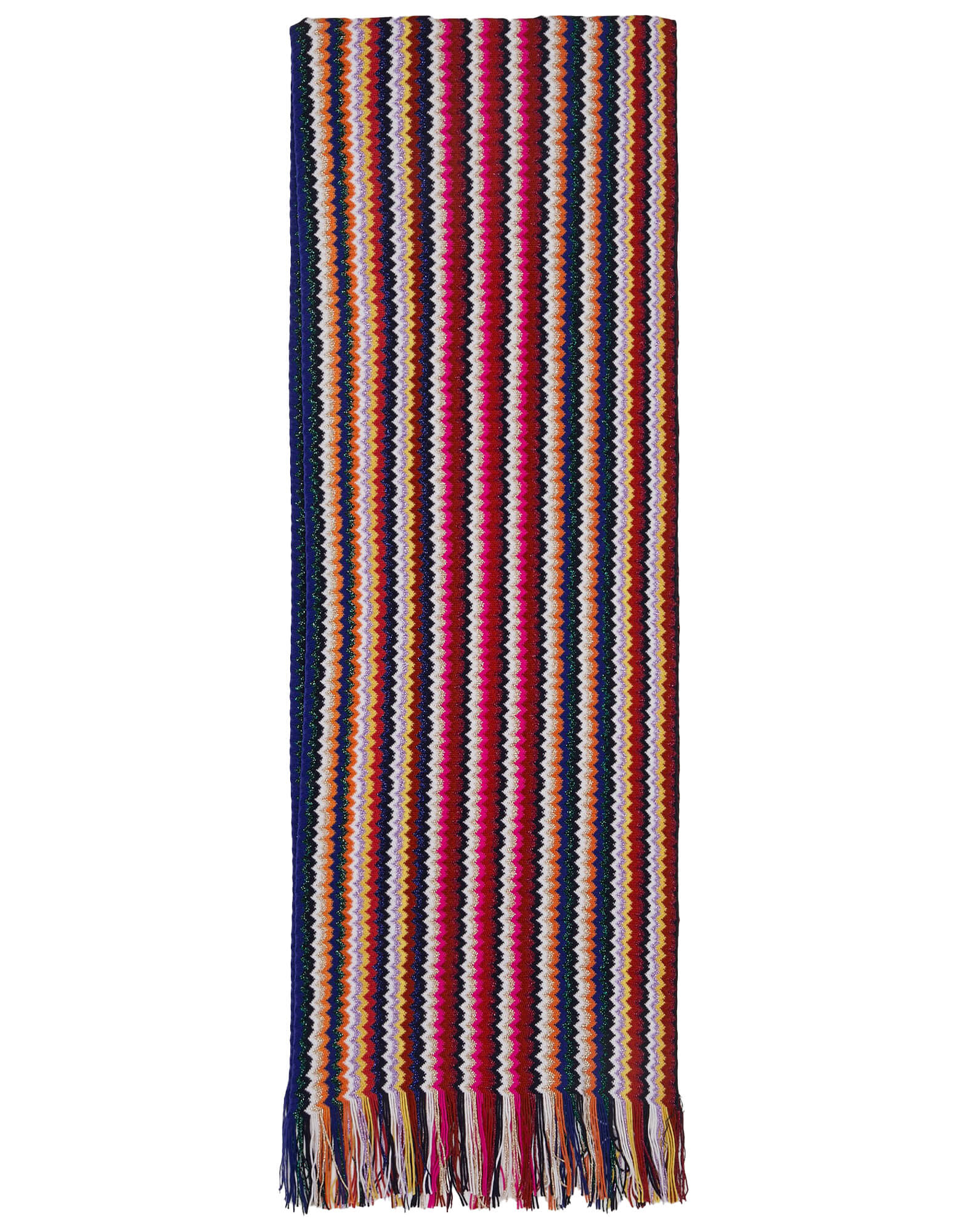 Sciarpa in misto viscosa e lana, fantasia zig zag, colori accesi, lurex. Frange sui profili. La posizione del pattern su tutta la superficie può variare. Made in Italy