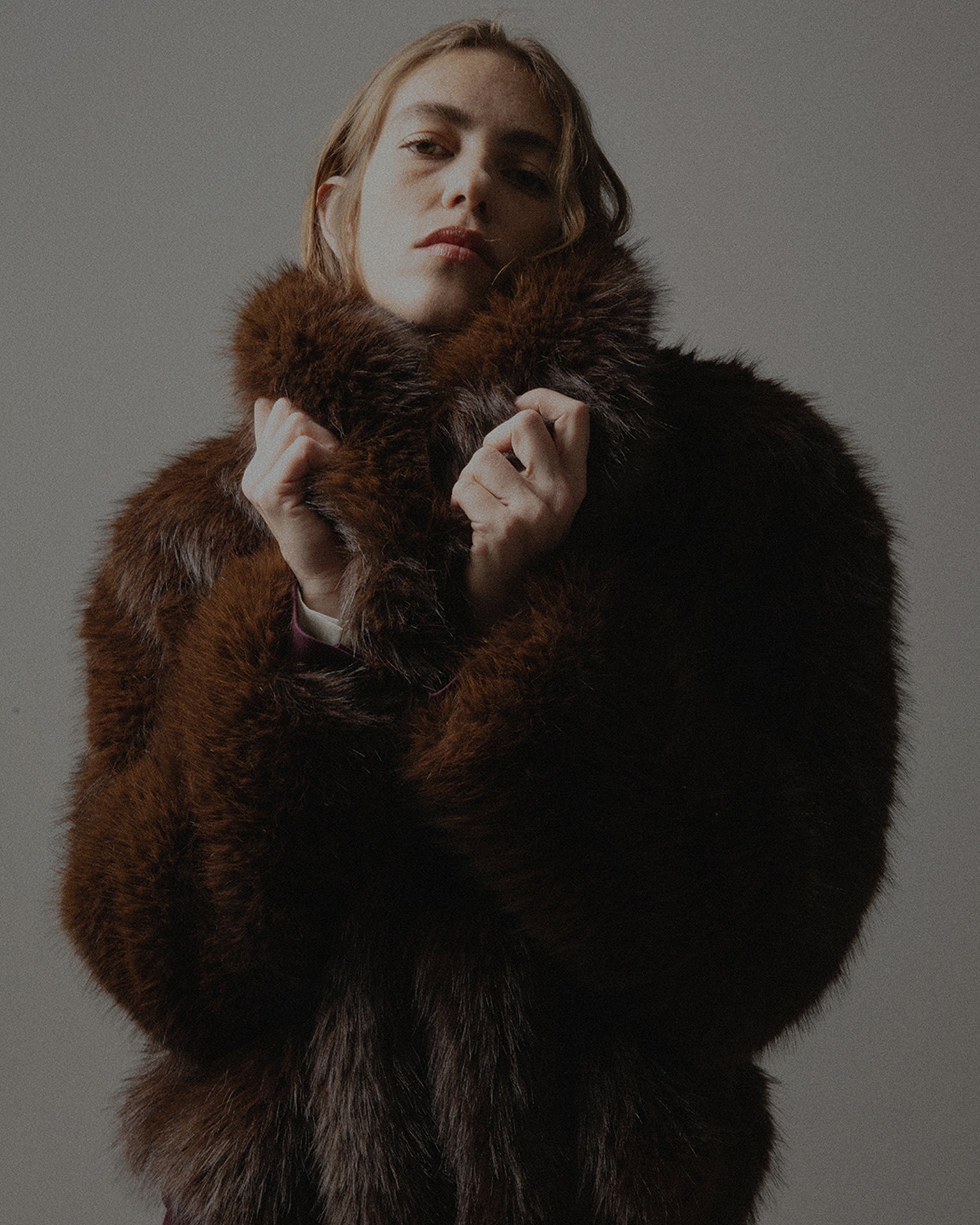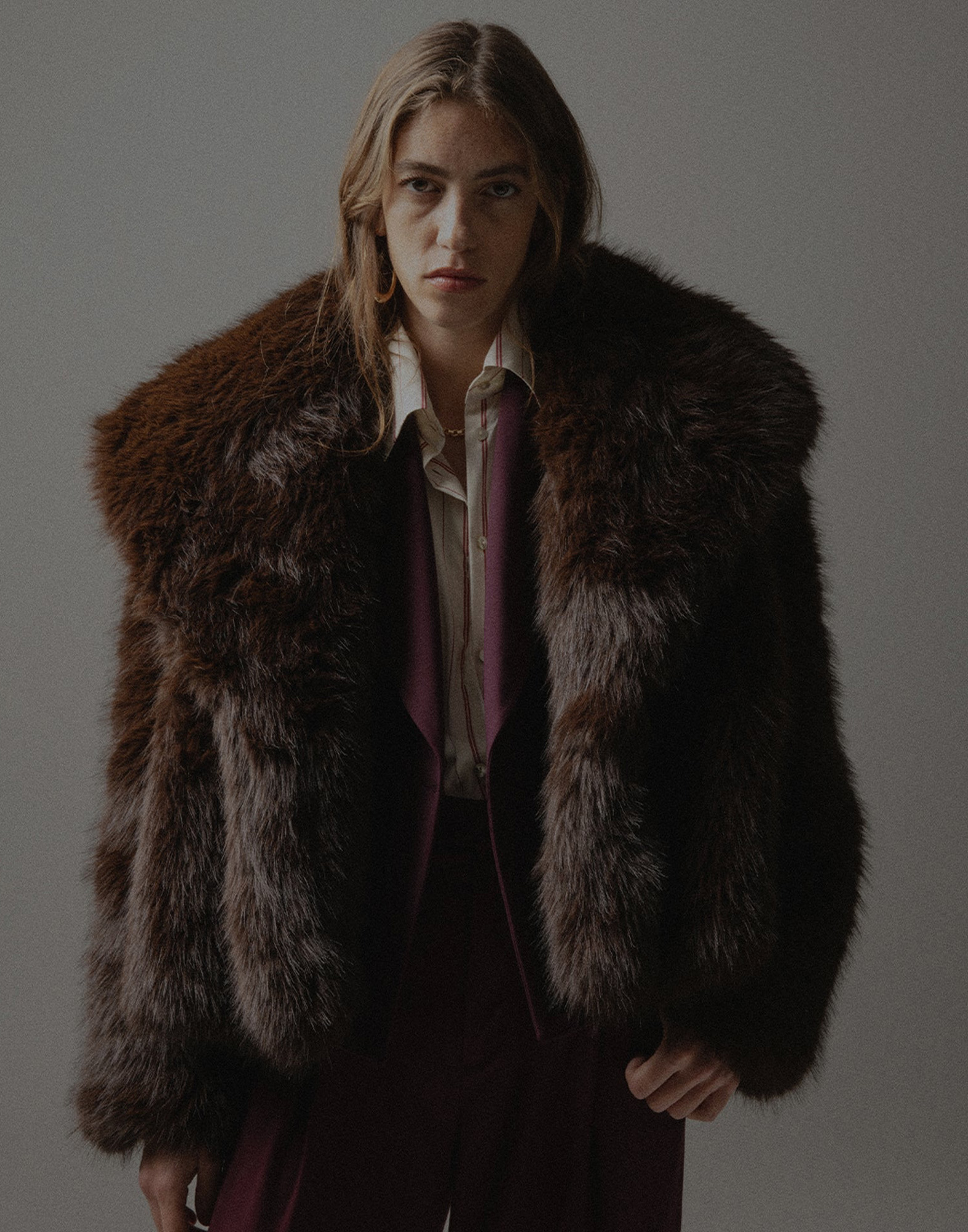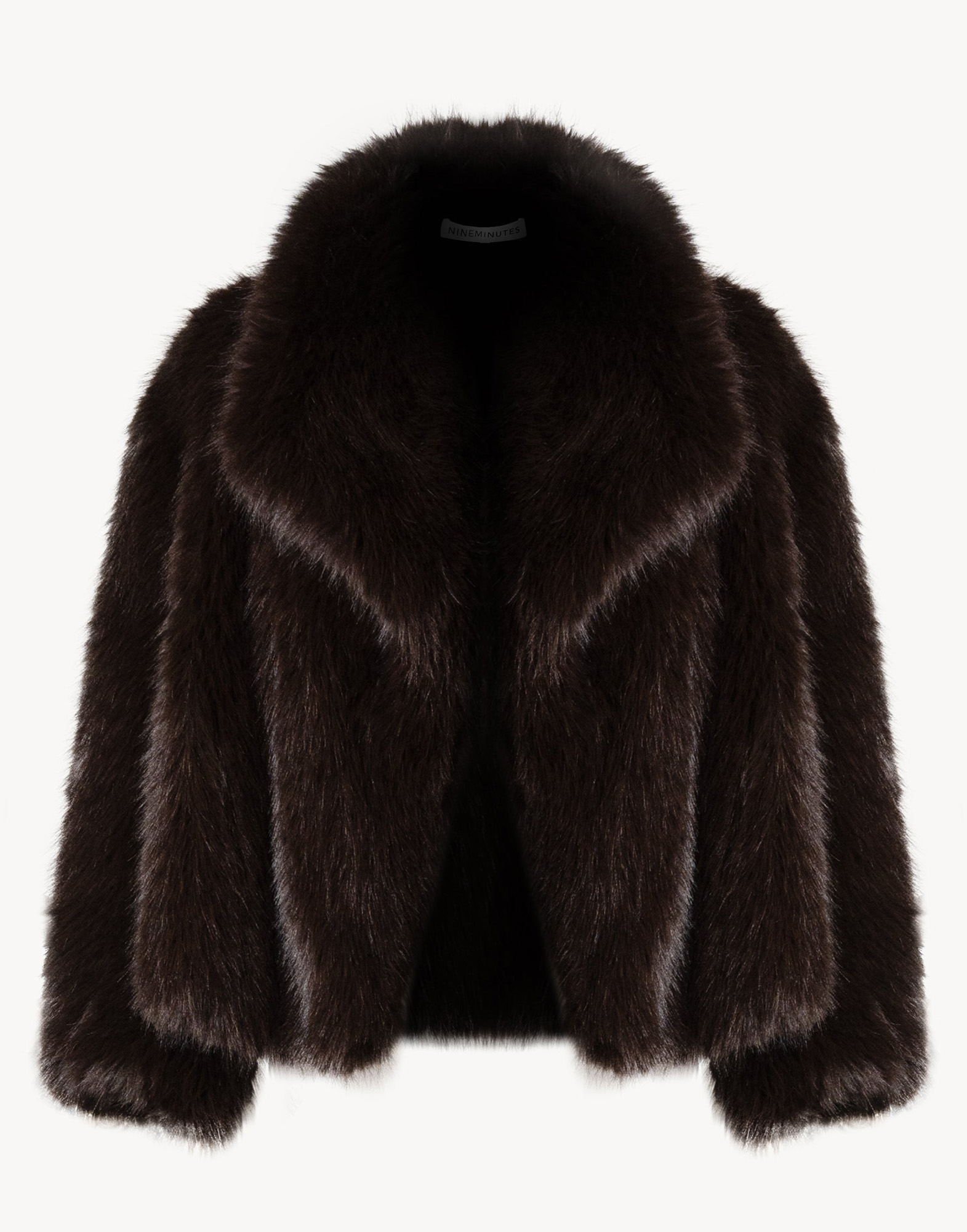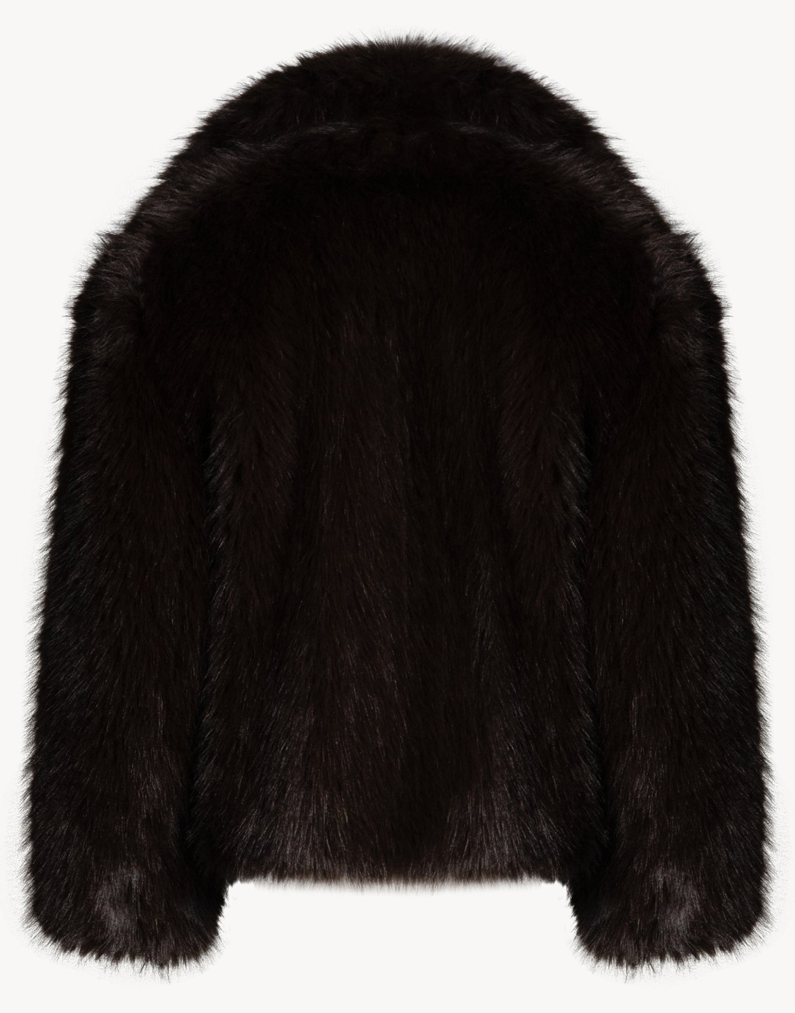 Ampia eco-pelliccia cropped, pelo lungo, ampio revers, foderata.