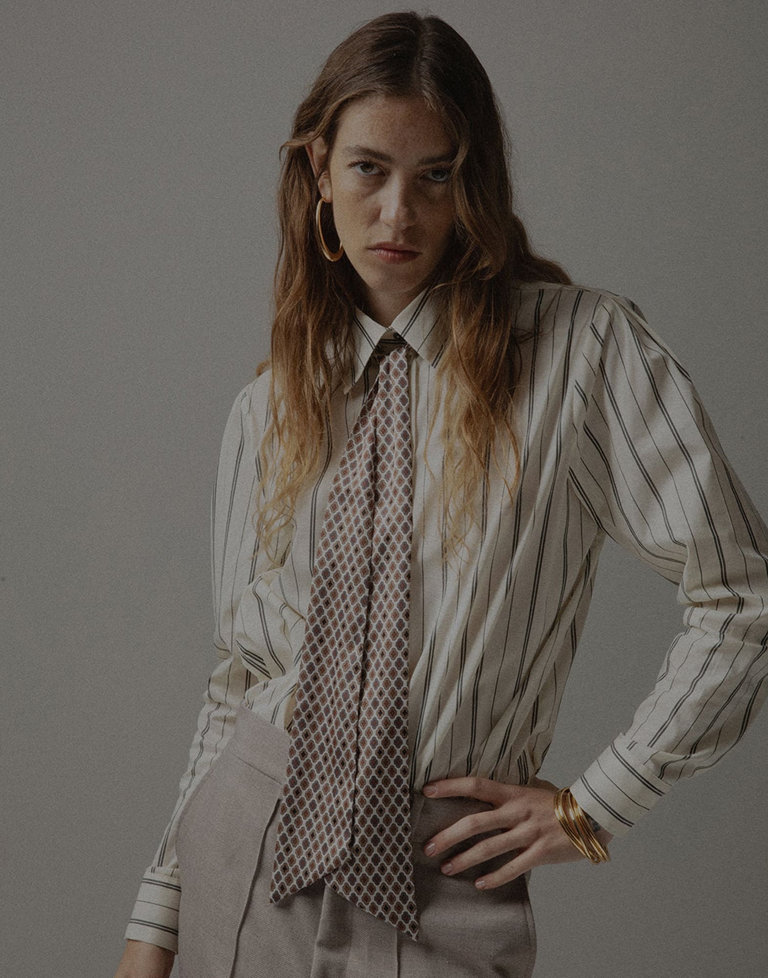 Camicia elegante donna a righe verticali, con colletto anni ’70. Maniche lunghe con polsino e chiusura frontale con bottoni. Design allungato e raffinato. Un capo versatile che interpreta in chiave contemporanea il fascino delle camicie vintage.