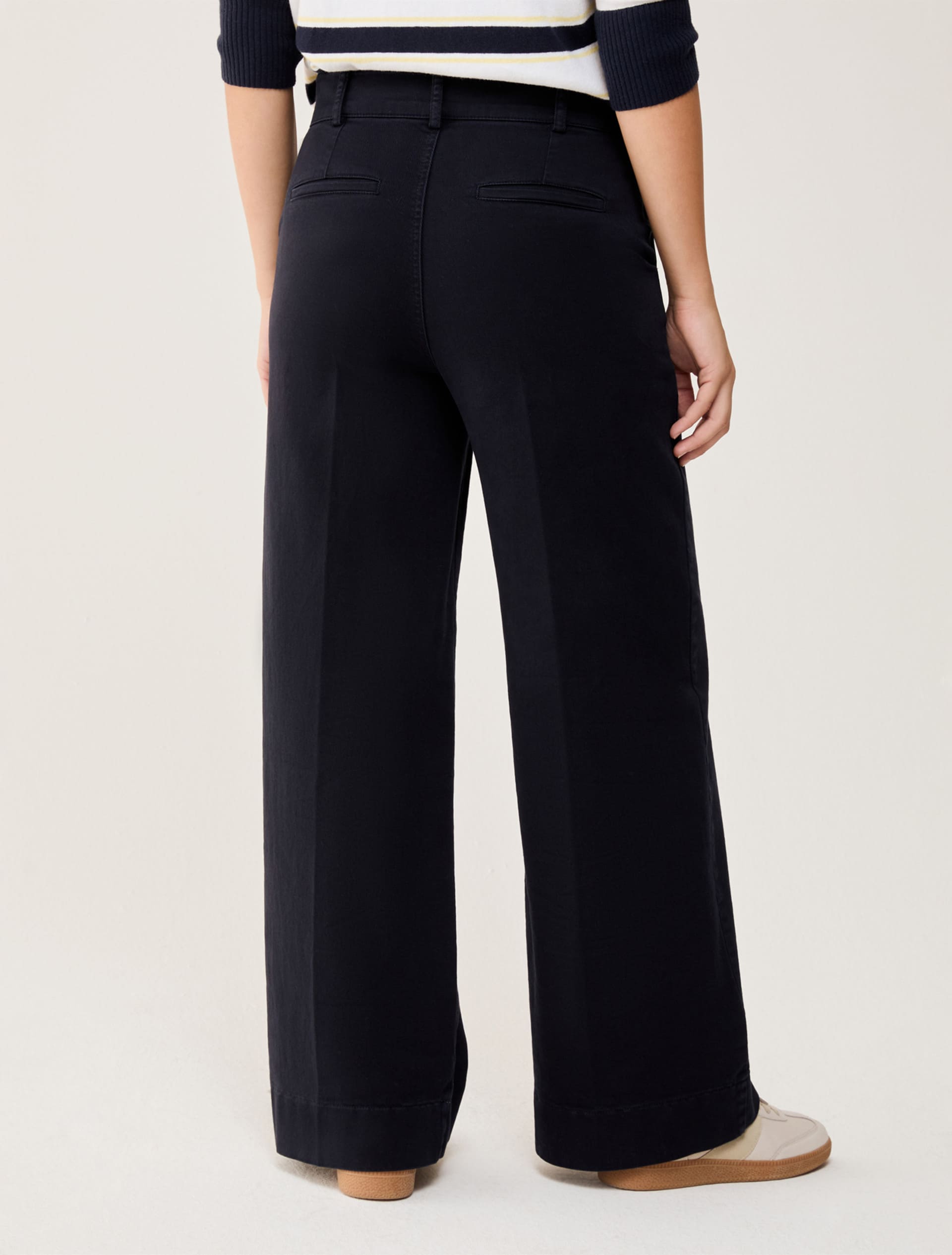 Bull di cotone stretch tinto in capo. Gamba diritta. Vita regolare con passanti. Tasche alla francese sul davanti, a filo sul retro. Chiusura con zip nascosta e bottone. Fit ampi