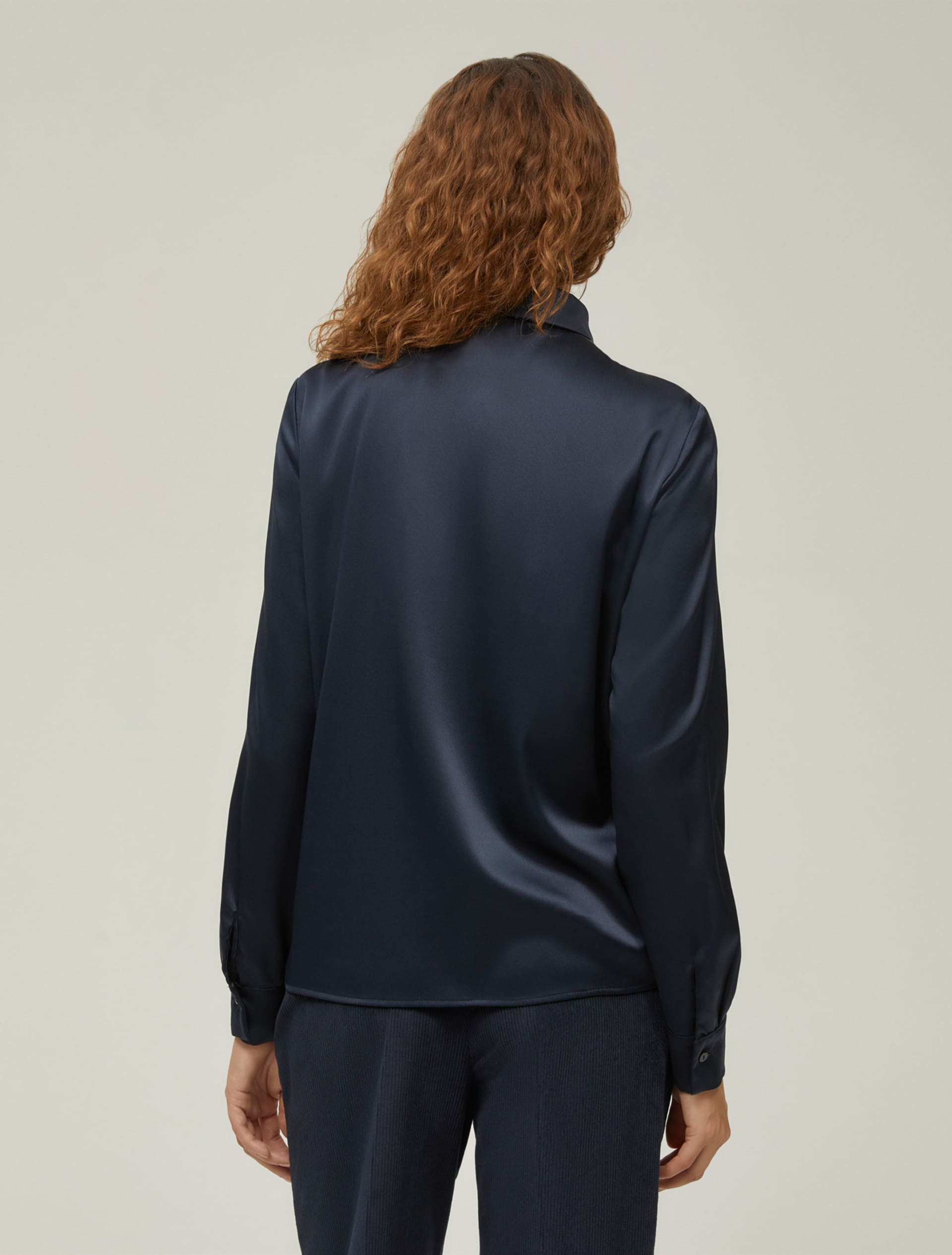 Camicia in raso di seta stretch. Ha un design pulito con bottoni nascosti e linee diritte che sfiorano il corpo. Passe-partout per un guardaroba chic, saprà elevare all’istante ogni look, dal party suit ai jeans.