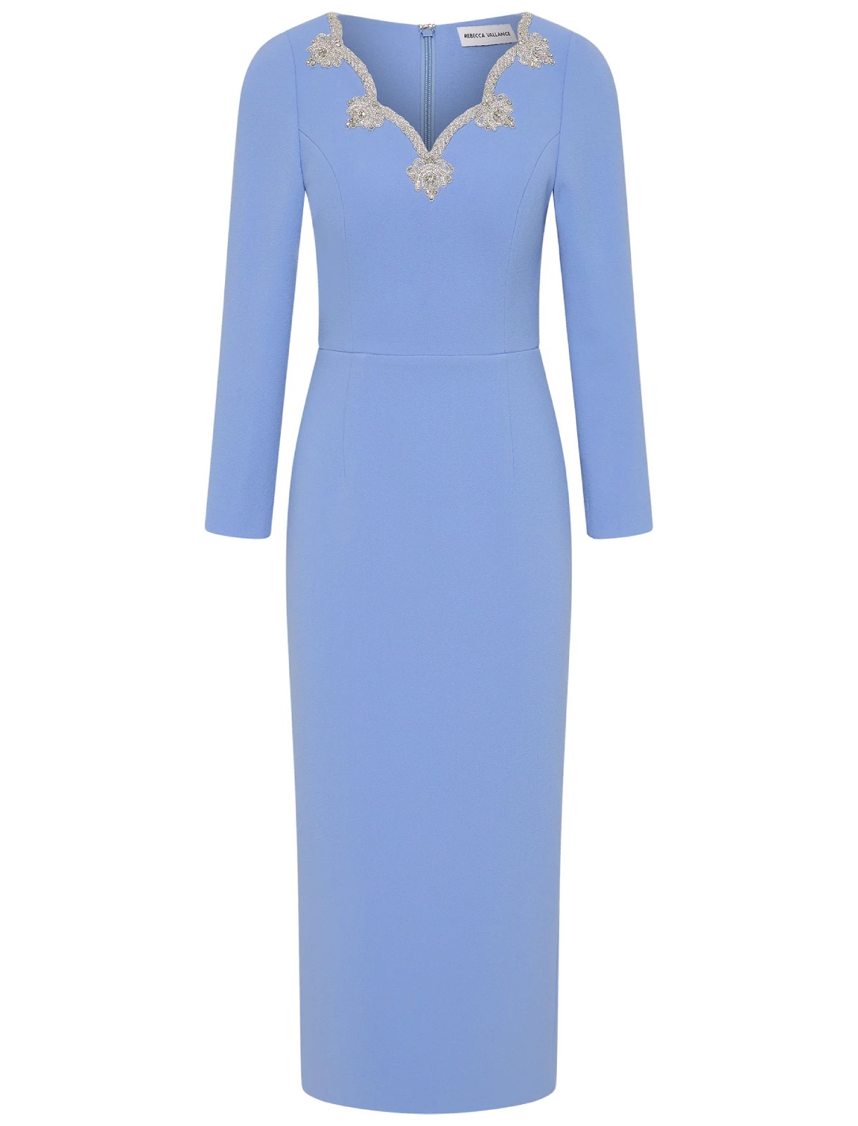 L'abito midi a maniche lunghe Harlynn in azzurro polvere incarna l'opulenza femminile, realizzato in crêpe accoppiato. Impreziosito da finiture con strass smerlati, lo scollo a V e il corpetto aderente disegnano una silhouette elegante, esaltata da raffinate maniche a tre quarti. La gonna midi a tubino scolpisce una figura slanciata, con uno spacco posteriore per una vestibilità disinvolta. Rifinito con fodera e chiusura con zip invisibile sul retro, questo abito è una scelta senza tempo per la tua prossima occasione speciale.