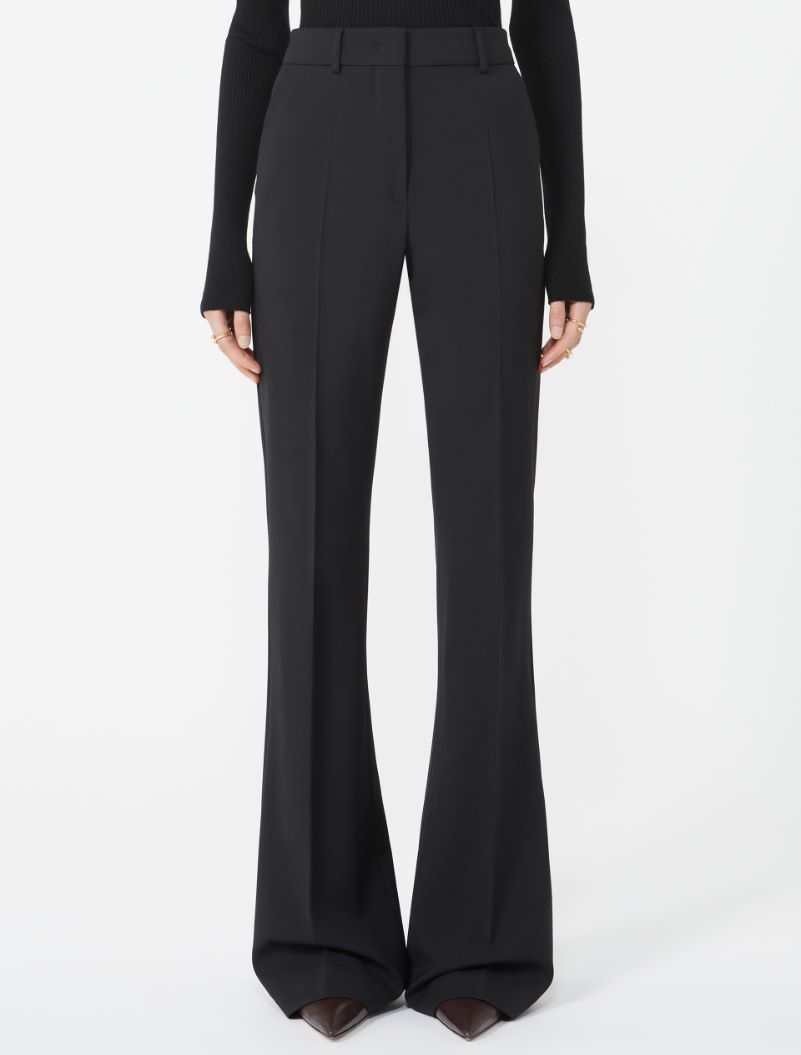 Pantalone aderente con linea flare al fondo, ispirato nei dettagli ai modelli tailoring maschili. Punto vita basso. Pantalone in saglia di lana stretch. Chiusura con gancio a uomo. Cintura interna personalizzata. Tasche laterali alla francese e posteriori a filetto. Piega stirata fronte e retro