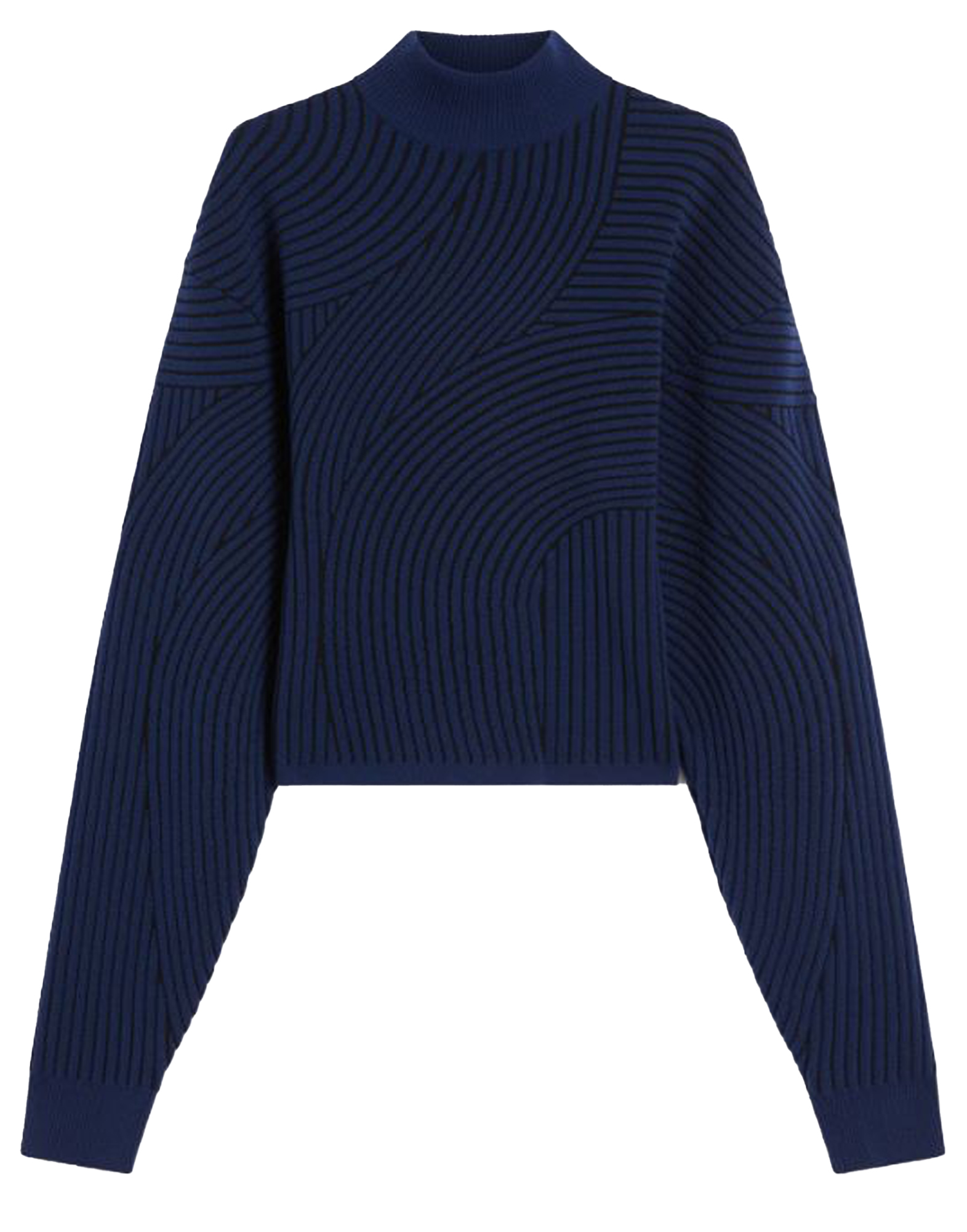 Maglia dal fit aderente, con maniche voluminose e collo alto. La lavorazione jacquard tridimensionale con linee sinuose decora tutto il modello. Motivo jacquard 3D curvilineo. Bordi con lavorazione a costine