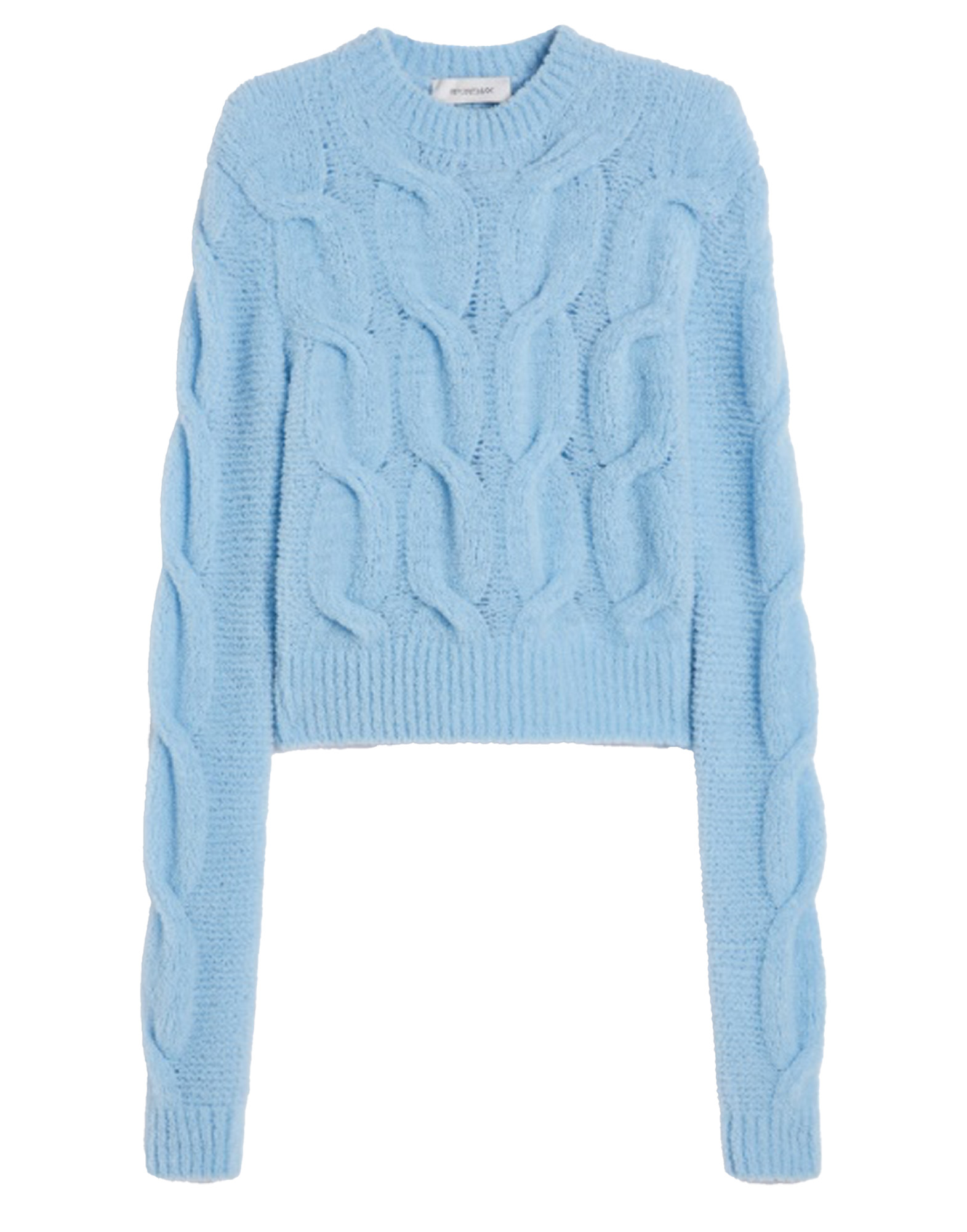 Maglia in filato soffice di misto lana, con lavorazione a trecce sul busto e treccia singola sul centro della manica. Scollo stondato. Collo e fondi lavorati a costine