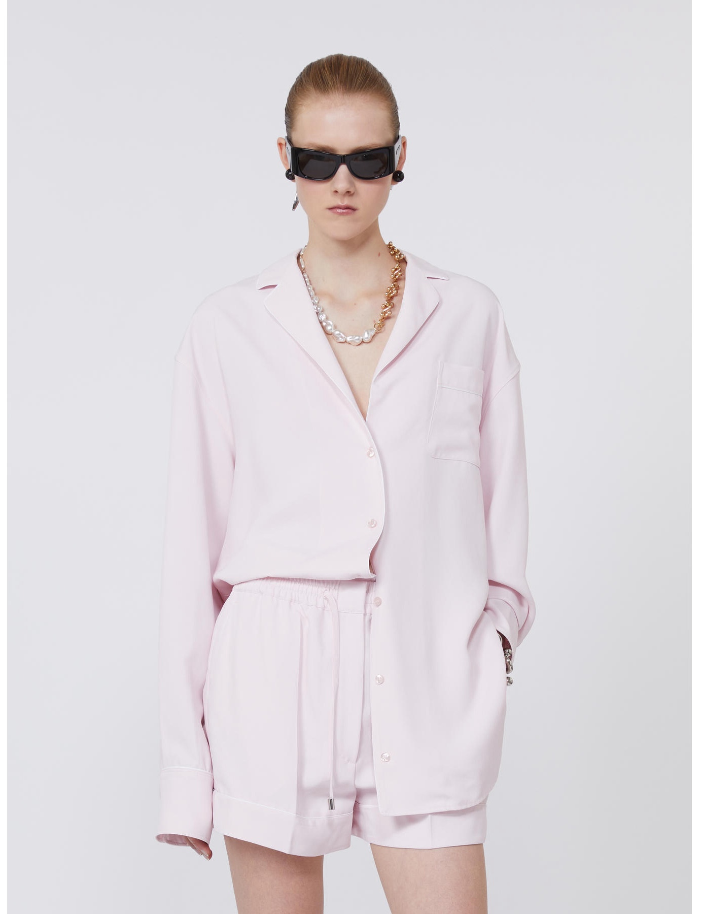 Over shirt in raso di viscosa lavato. Collo con piccolo rever. Maniche con alamaro interno per risvolto. Fondo stondato. Vestibilità regolare