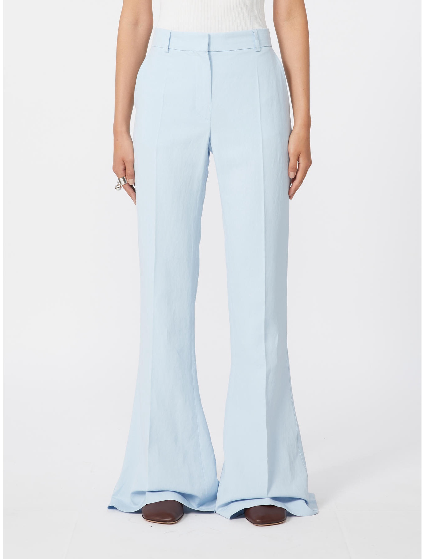 Pantalone dalla linea flare, con fit aderente e linea femminile. La costruzione si ispira ai modelli sartoriali , con allacciatura coperta e piega stirata. Piccolo spacco sovrapposto sul retro per una linea ancora più svasata sul piede.